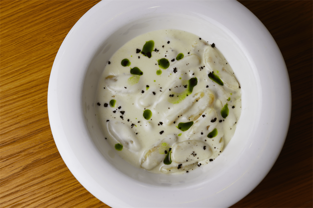 Квадро Формаджи: пицца на сливочном соусе с нежной моцареллой, горгонзолой, пармезаном, пикантным камамбером и сочной рукколой.